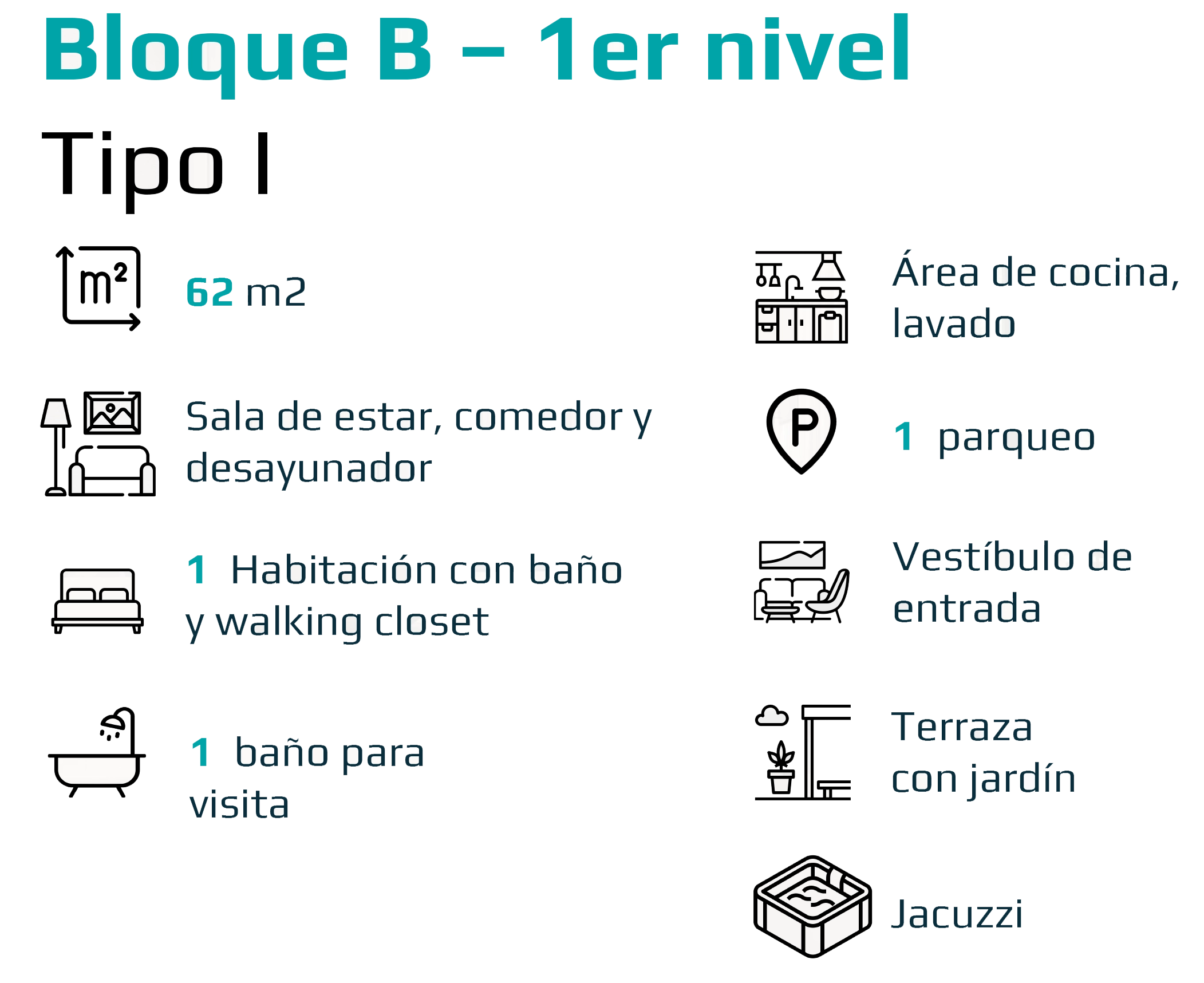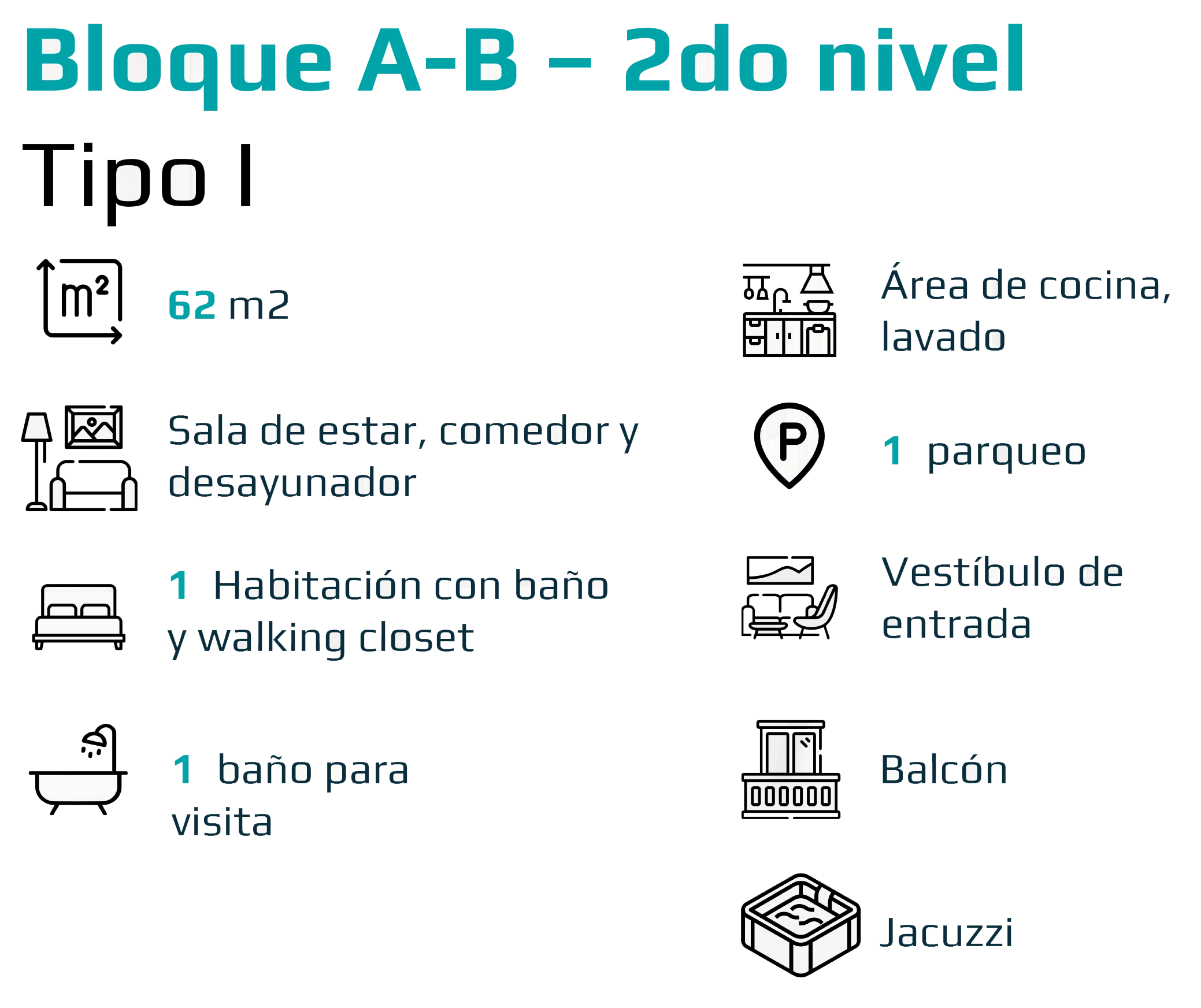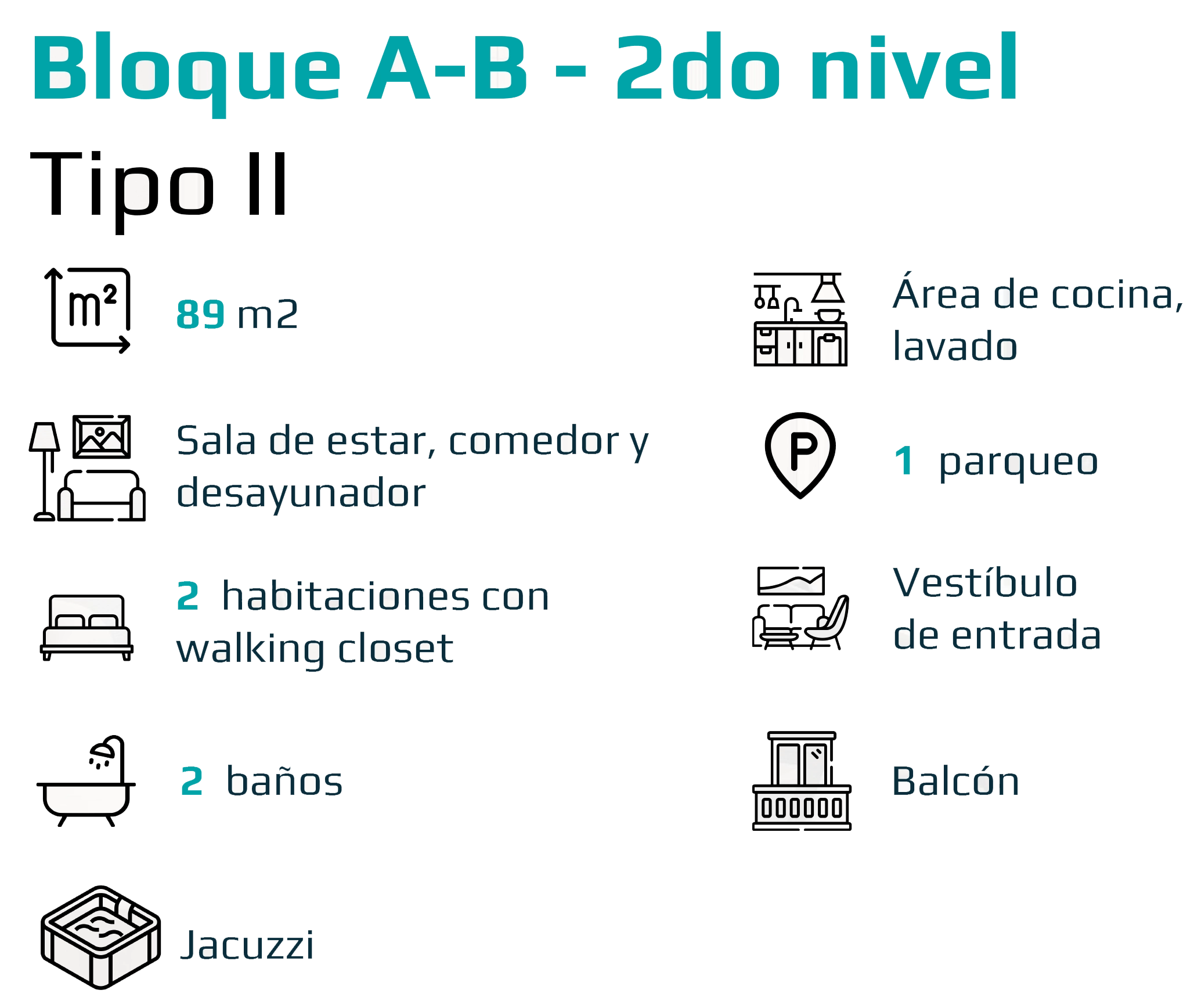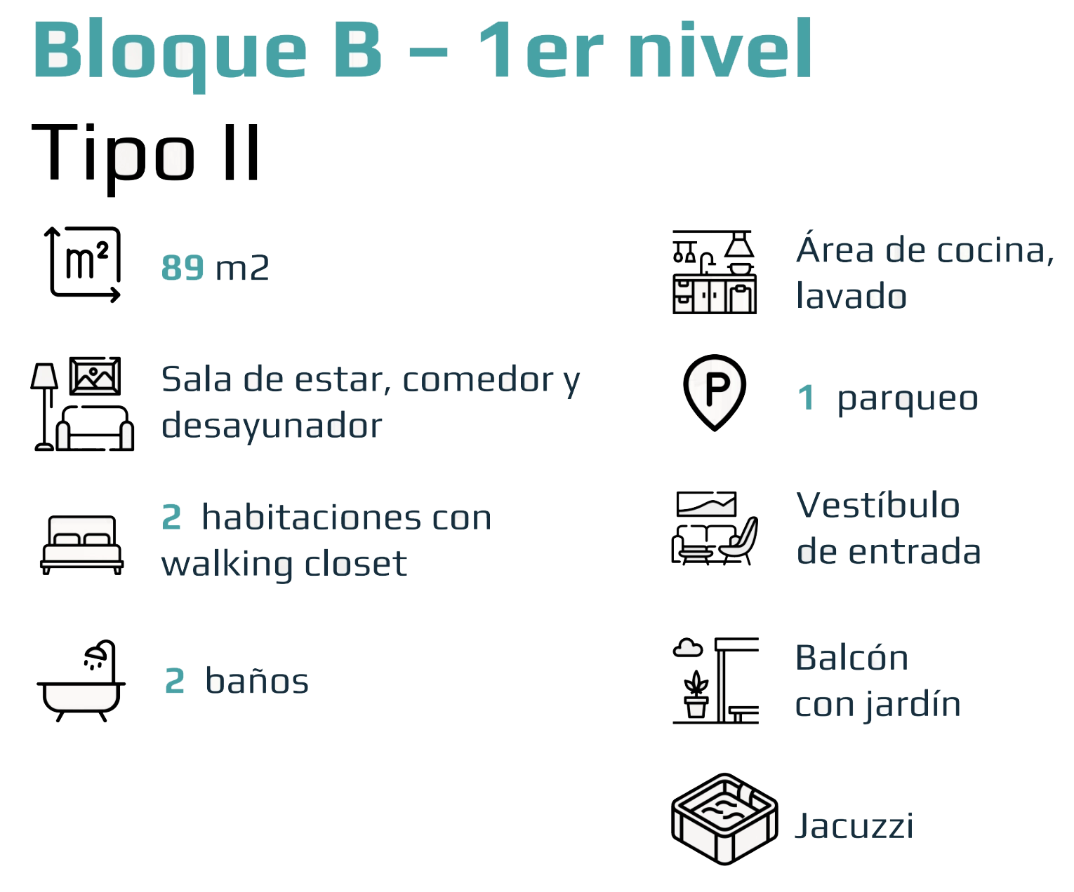 Desde 62 m² hasta 89 m², con terrazas, walking closets y opción a jacuzzi privado.